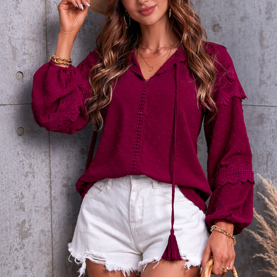 Crochet Tassel Tie Neck Long Sleeve Blouse