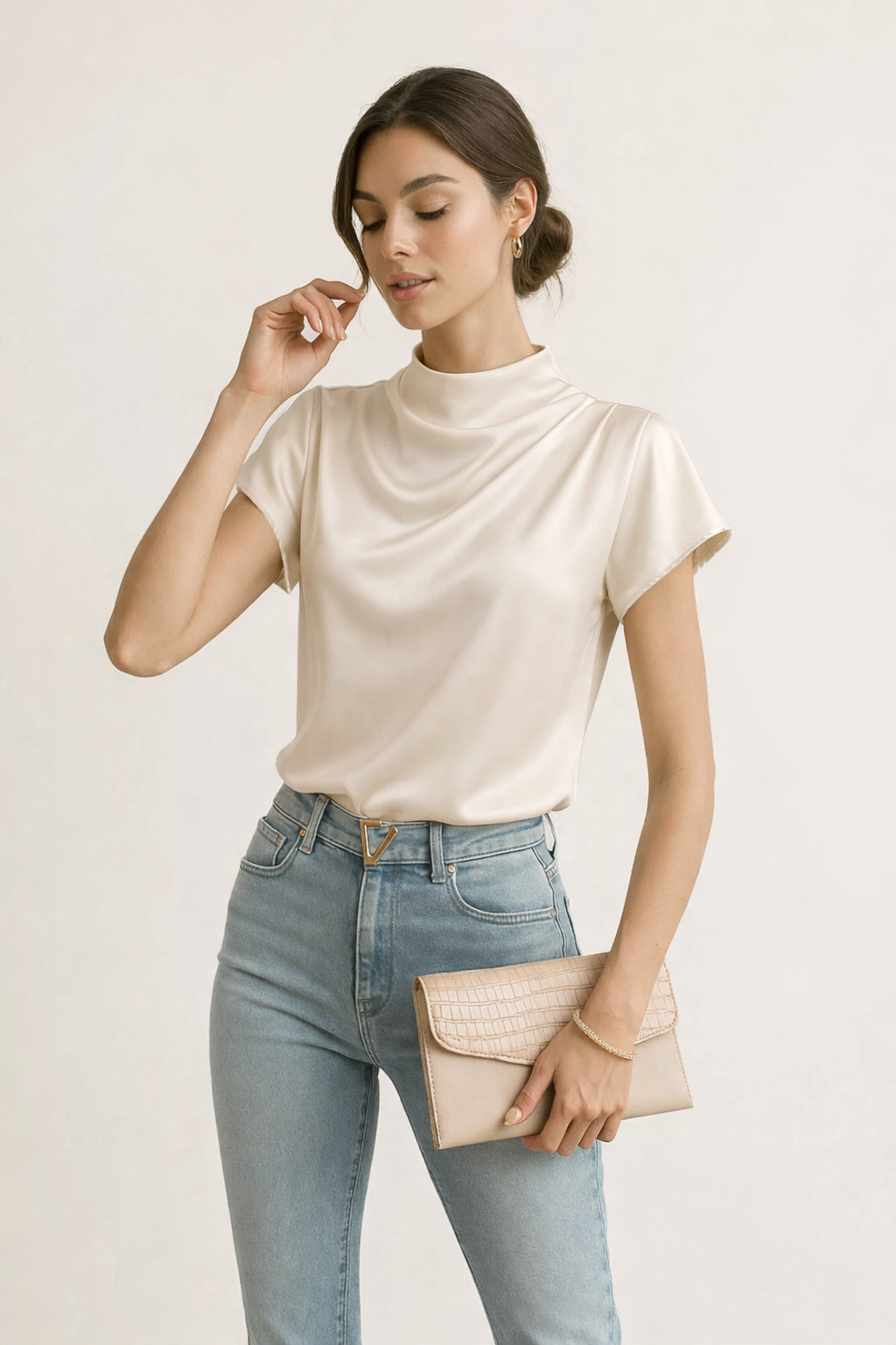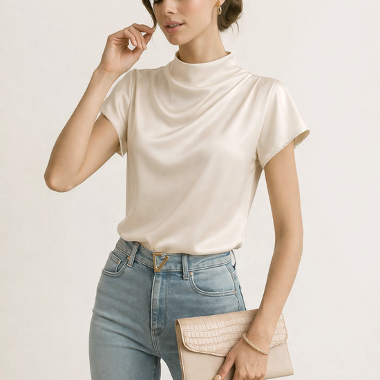 Mock Neck Short Sleeve Satin Blouse